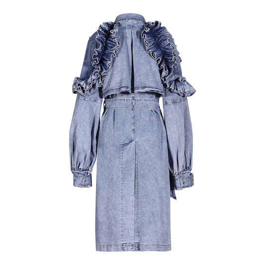 Loose Lapel Double Breasted Long Sleeves Windbreaker Denim Ruffle Trench Coat